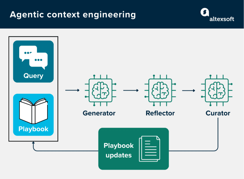 The 2025 arXiv paper Agentic Context Engineering (ACE) solves this with a three-agent loop: