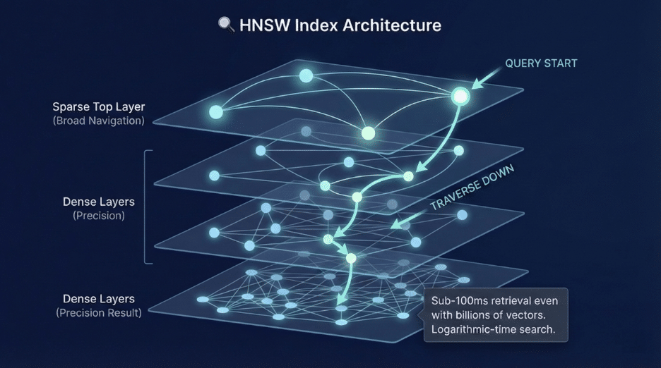The compression is staggering. A 3KB chunk of text becomes a 96-byte vector when using Product Quantization. We can keep 30x more vectors in memory, enabling real-time search across billions of documents.
