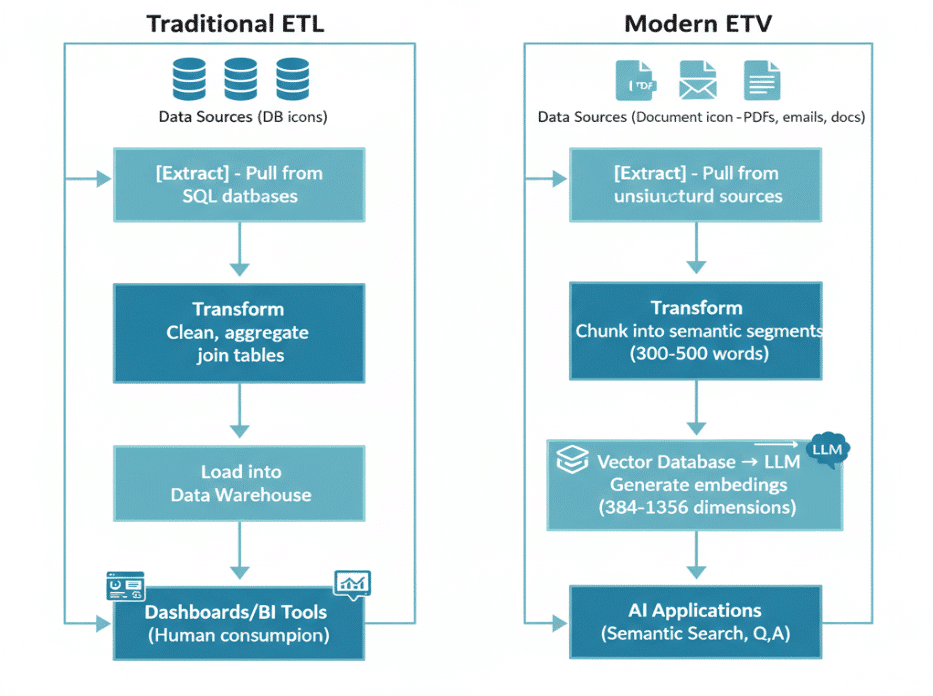 | Core Process | ETL: Extract → Transform → Load | ETV: Extract → Transform → Vectorize |