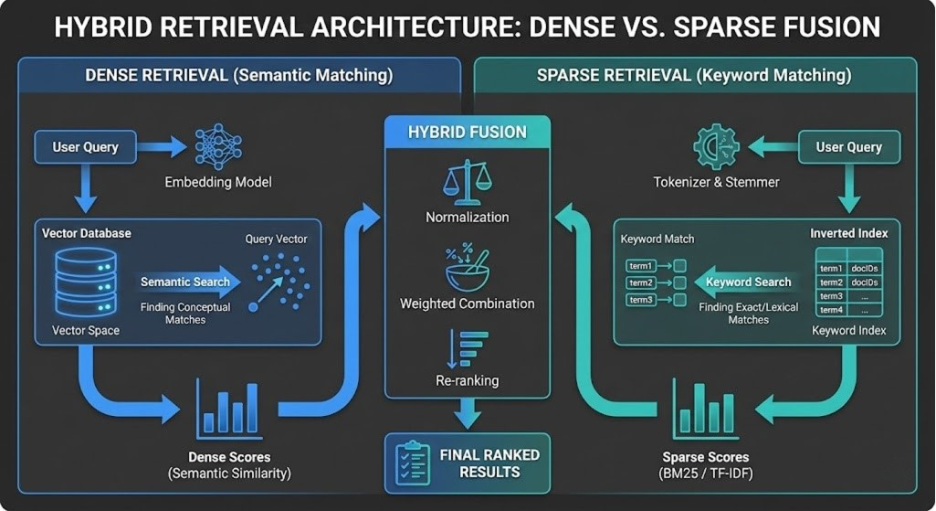 → Dense Retrieval + Sparse Retrieval → RRF Fusion