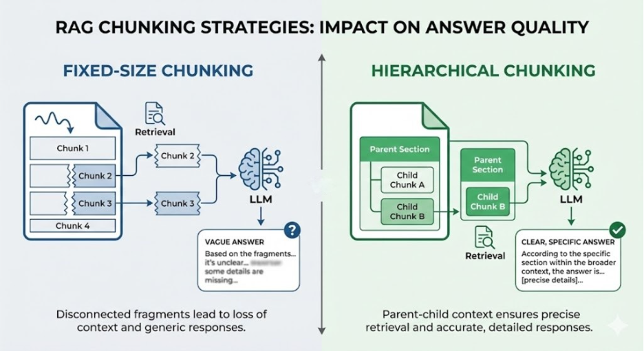 • Chunks too small → each chunk loses context → the answer exists but can’t be understood in isolation
