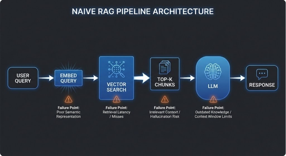 RAG solves the LLM’s knowledge problem. But naive RAG — embed, retrieve top-K, generate — introduces its own failure modes. And these failures are silent: the system returns an answer, it just happens to be wrong.